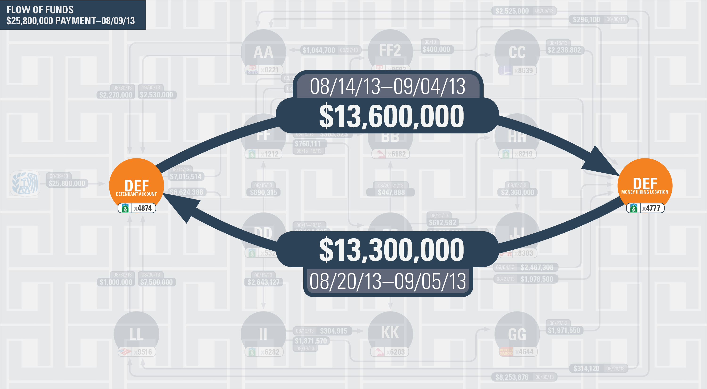 This is a small glimpse of an immense scheme used to defraud the United States involving tax credits linked to the production of biodiesel fuels. Here, the IRS cut a $25M check for claims that the defendant had produced many thousands of gallons of biodiesel that they, in fact, did not produce. This demonstrative shows the flow of funds from that check across 11 different accounts over time and the later repatriation of much of it back to the original account. Fraud-tastic!