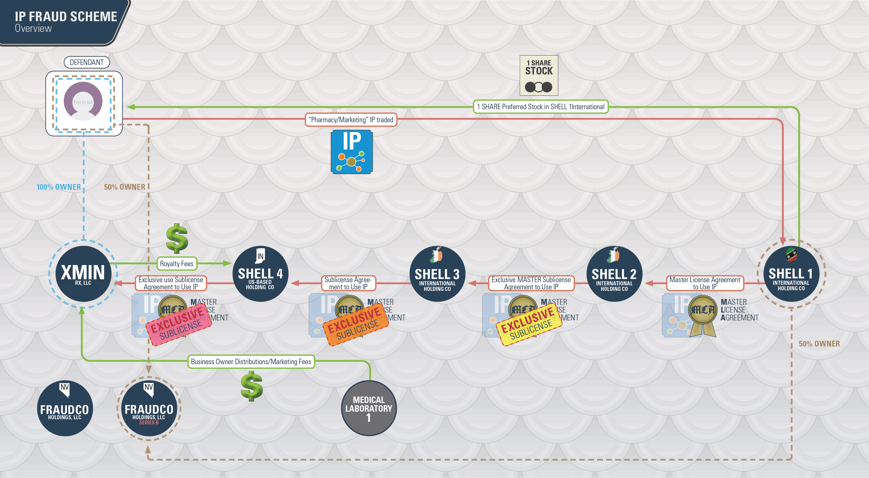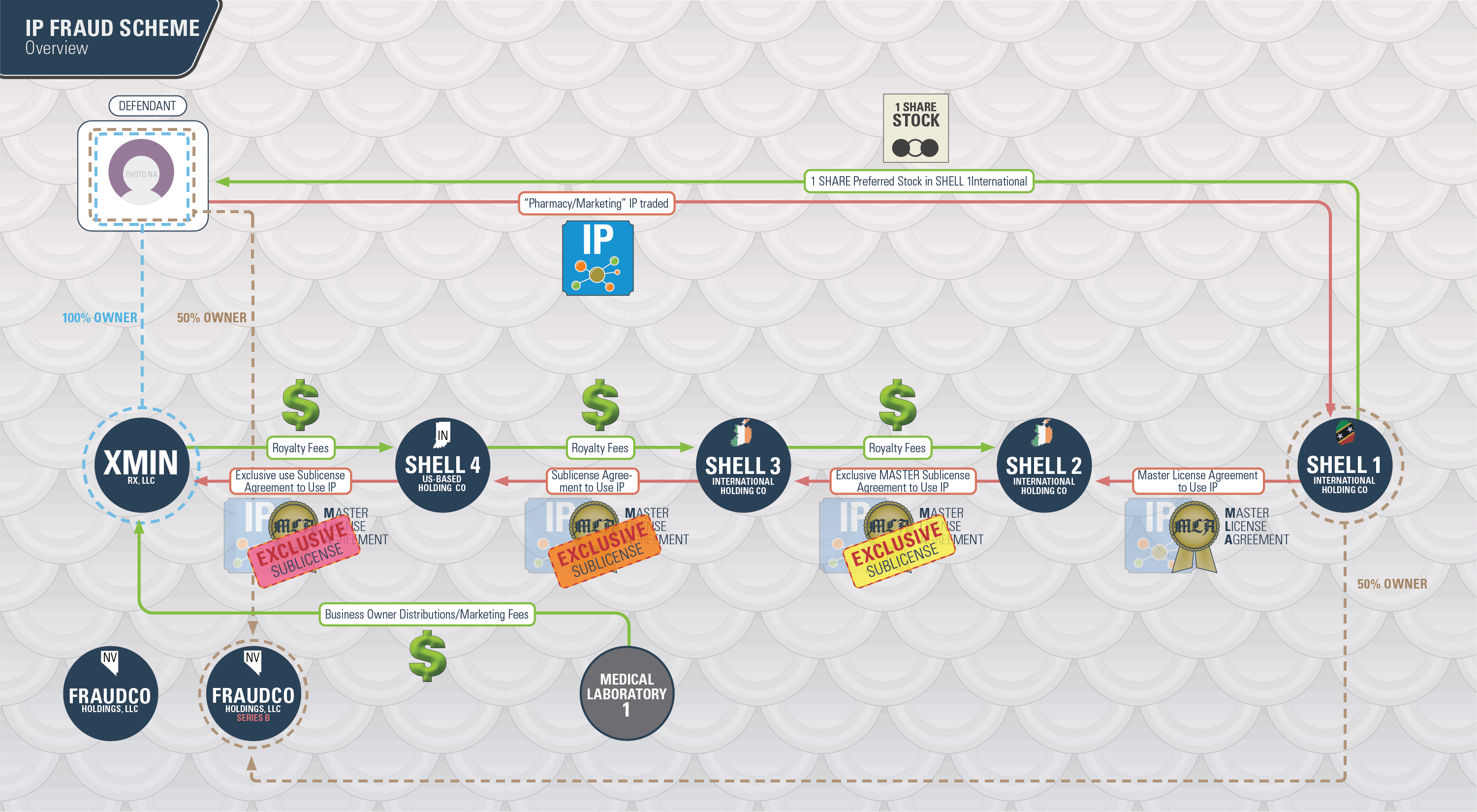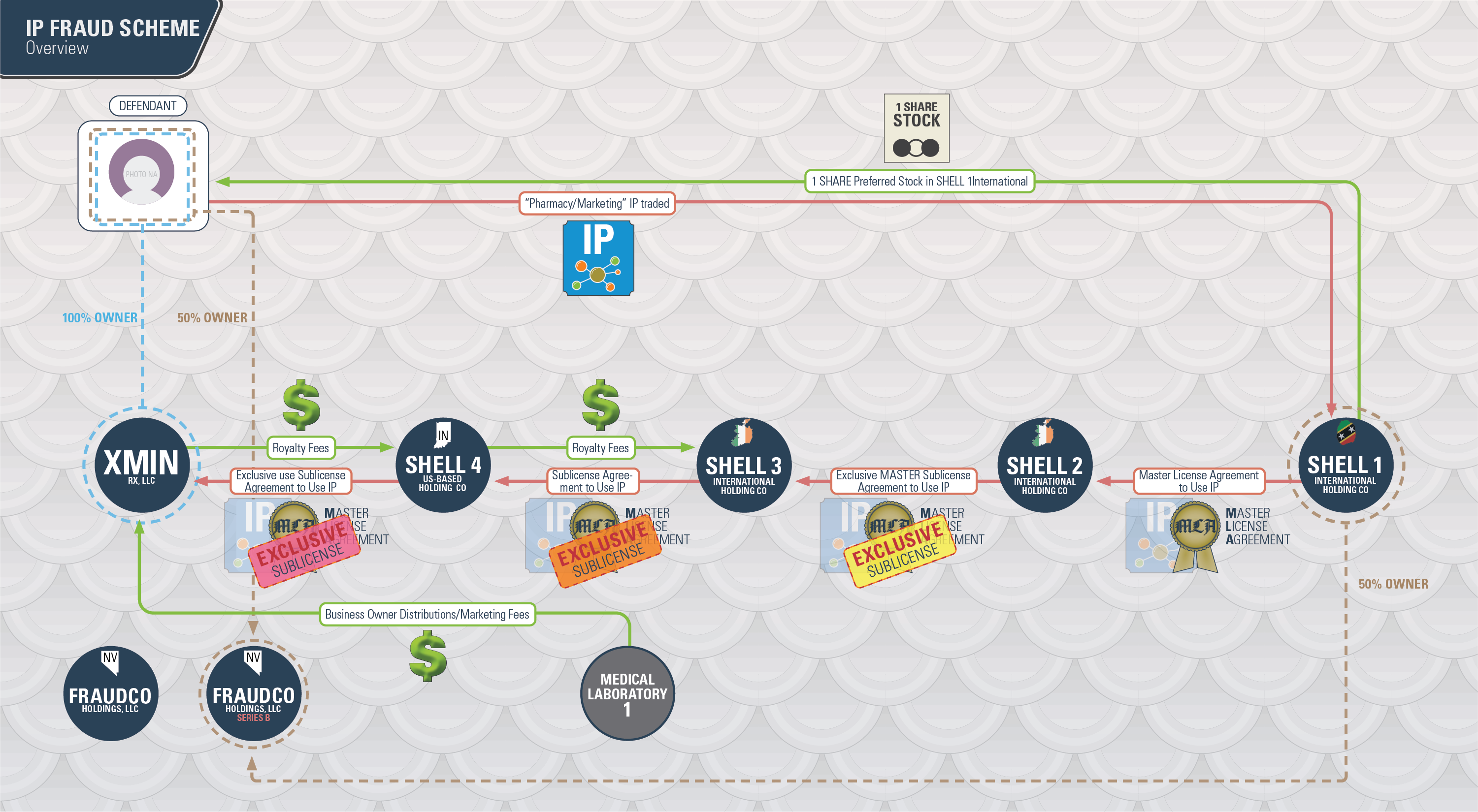 This is one facet of a large scheme to defraud patients and Medicare using a license for an exclusive chemical/pharmaceutical compound. The defendant ‘sold’ his rights to the intellectual property through multiple fake companies to hide the ownership, then ‘purchased’ the license using another company he owned. This company collected fees from laboratories for use of the license as well as multiple layers of royalties. It was a quadruple dipped scheme with sprinkles on top.